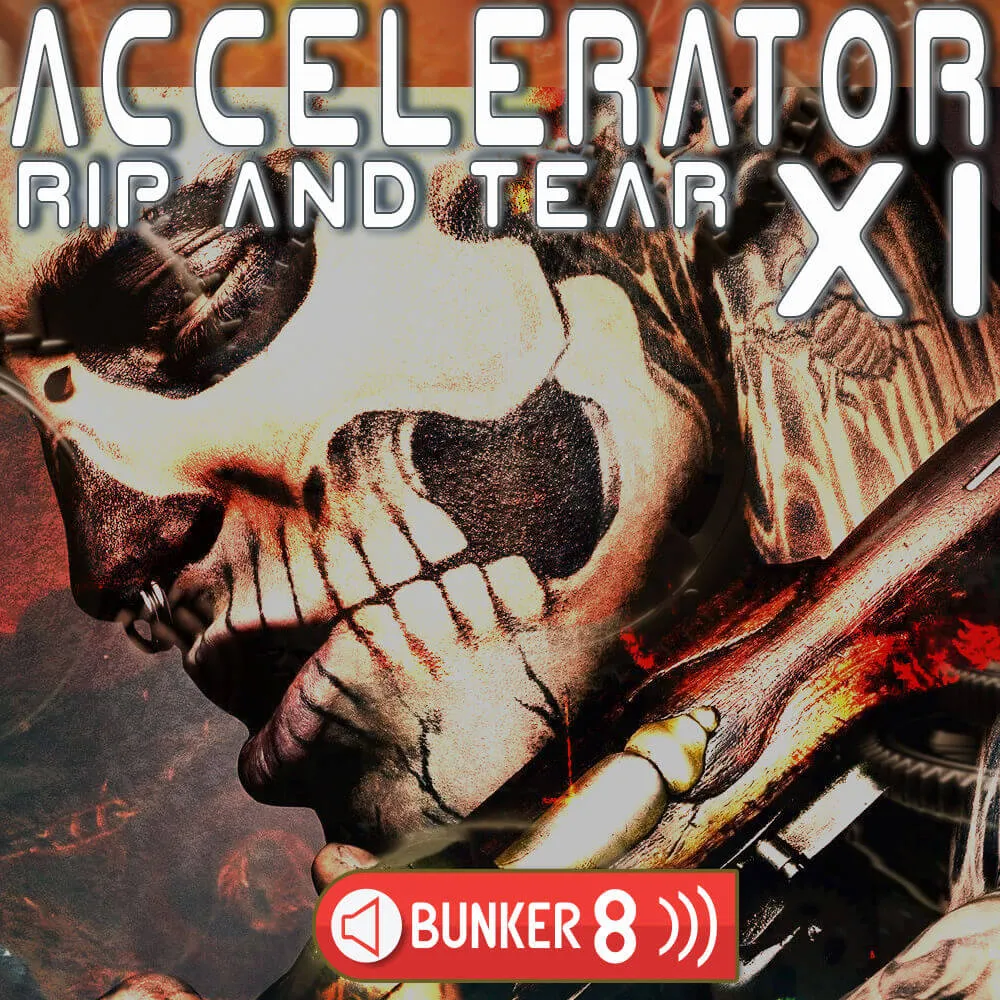 'Accelerator 11 Rip and Tear' features deep sub basses, throbbing subsonic arps, thrash metal guitars, knock the cones out of your subwoofer kicks, percussion and loops galore. This is everything you need and everything you hear in the demo tracks is in this collection. The live tracks have been seamlessly meshed with sampled instruments. Extensive use of live instrumentation, drum kits, heavy 9 string guitars, deep basses and extended distortion boxes and pedals.